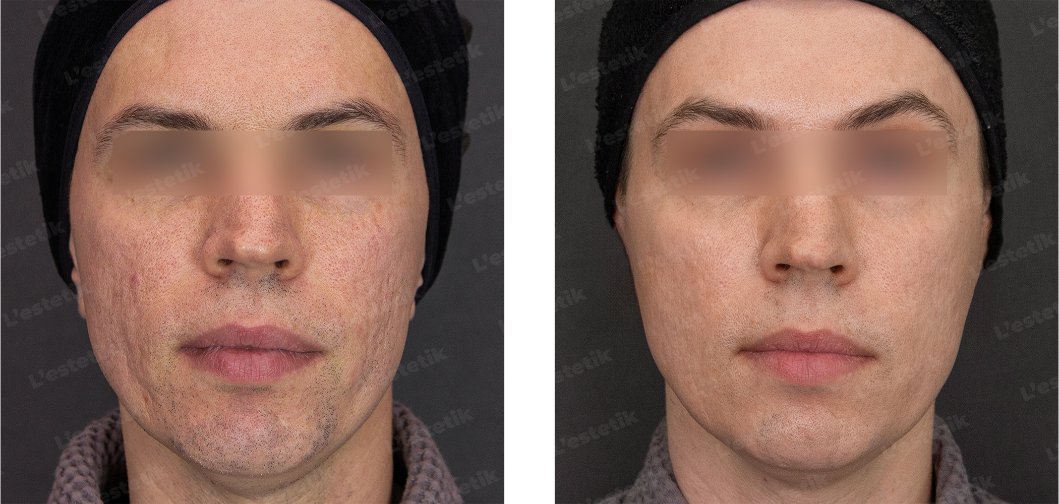 Пациент: 38 лет, жалобы: фиброзные изменения, атрофические рубцы пост-акне, широкие поры, гиперпродукция сальных желез, гиперкератоз